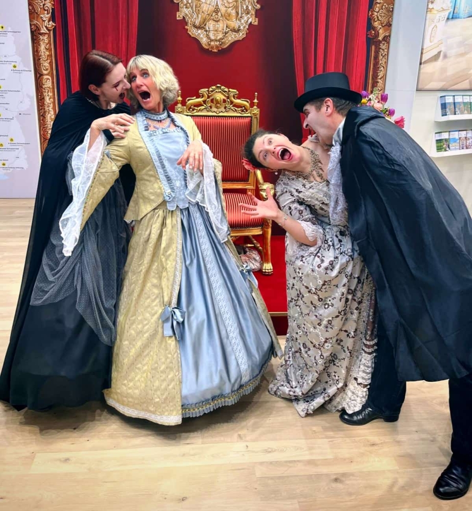 Auch in diesem Jahr waren unsere Walking Acts auf der CMT – genauer in Halle 6 – rund um den Stand der Schwäbischen Alb unterwegs. Am Dienstag vergangener Woche wurde sogar Graf Dracula samt Gattin auf der CMT gesichtet… Die beiden haben sich ganz in den Dienst unseres Theaters gestellt, haben viele Flyer für die Winter- und Sommersaison verteilt, standen für Fotos und Selfies zur Verfügung, haben positive Werbung für unser Theater gemacht und viele Fragen beantwortet. Die Nachfrage nach unseren Flyern war groß und wir hoffen, dass der ein oder andere Besuch in unserem Theater folgen wird – aber wir sind sicher, dass Graf Dracula als Werbebotschafter Eindruck hinterlassen hat.